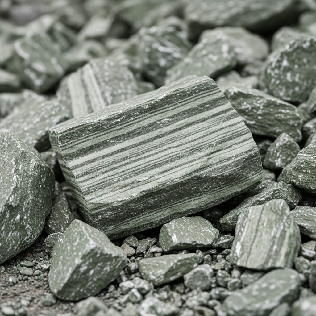 Serizitgneis ist ein metamorphes Gestein mit charakteristischer Textur und Farbgebung. Seine individuellen Farbnuancen verleihen Gabionen eine einzigartige und edle Optik.
