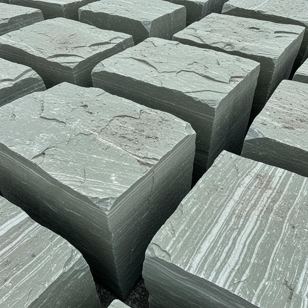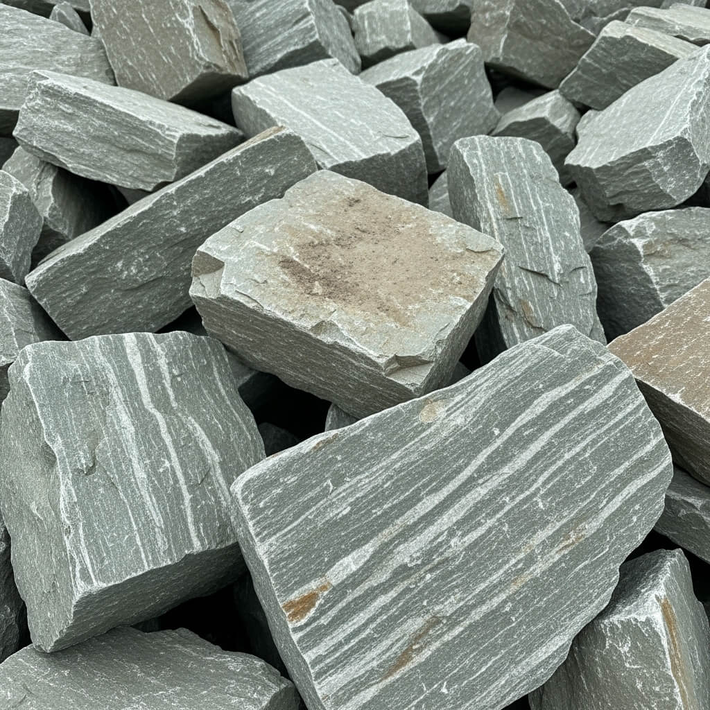 Dieser Hartkalkstein zeichnet sich durch seine Farbpalette von Grau bis Anthrazit mit weißen Quarzeinschlüssen aus. Er verleiht Gabionen eine zeitlose Eleganz und fügt sich harmonisch in verschiedene Gartenstile ein.